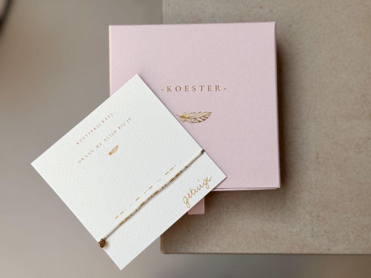 Met de exclusieve Koesterdoos geef je een betekenisvol geschenk dat herinneringen koestert. De Koesterdoos bevat een prachtig verpakt Morsejuweel en een Koesterkaart waarop je een persoonlijke boodschap kunt schrijven. Dit fijne armbandje, ontworpen met een unieke morsecode, is samengesteld uit pareltjes in een kleur naar keuze (tip: Something Blue?). De gouden morseparels in het armbandje bevatten een persoonlijke boodschap die alleen jij en je geliefde kennen.