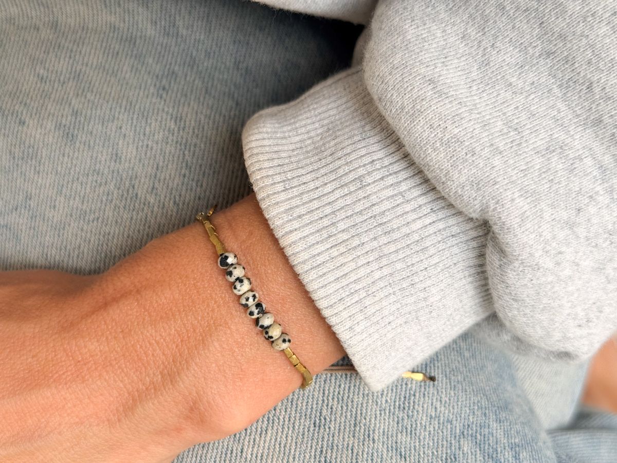 Elk Think Happy juweel is uniek. Bij elke bestelling selecteer ik persoonlijk de beste Dalmatian Jasper steentjes voor jou. Jouw armband wordt met de hand en met zorg speciaal voor jou gemaakt. Dit maakt elke Think Happy armband niet alleen een prachtig sieraad, maar ook een persoonlijk en betekenisvol geschenk dat speelsheid en vreugde in je leven brengt.